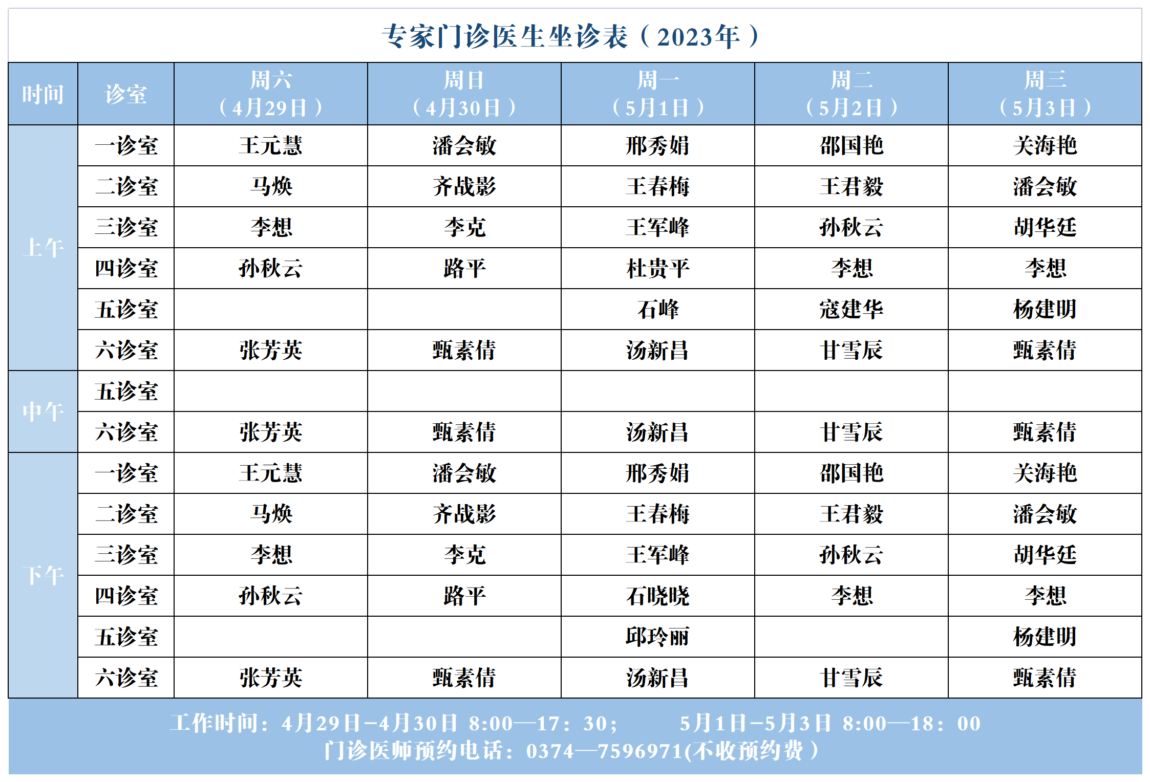 【坐诊信息】许昌市建安医院“劳动节”假期期间门诊坐诊表(2023年4月29日-2023年5月3日)