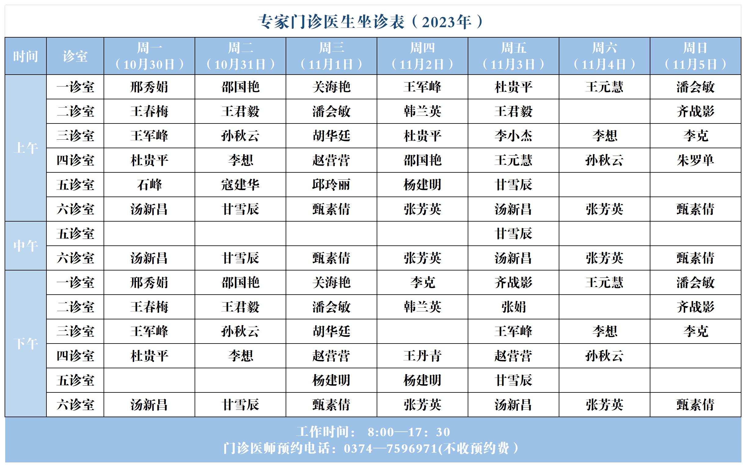 【坐诊信息】许昌市建安医院门诊坐诊表(2023年10月30日-11月5日)