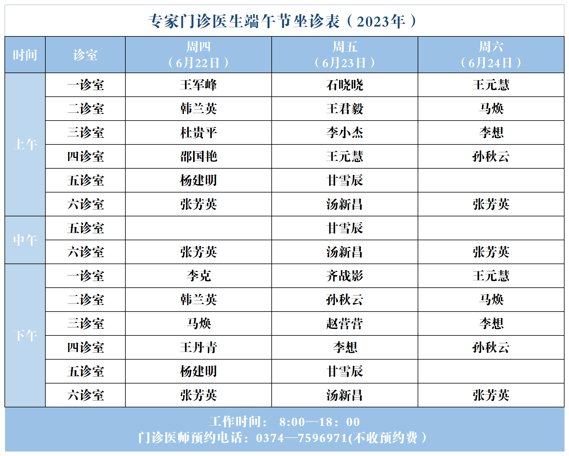 【坐诊信息】许昌市建安医院“端午节”假期期间门诊坐诊表(2023年6月22日-2023年6月24日)