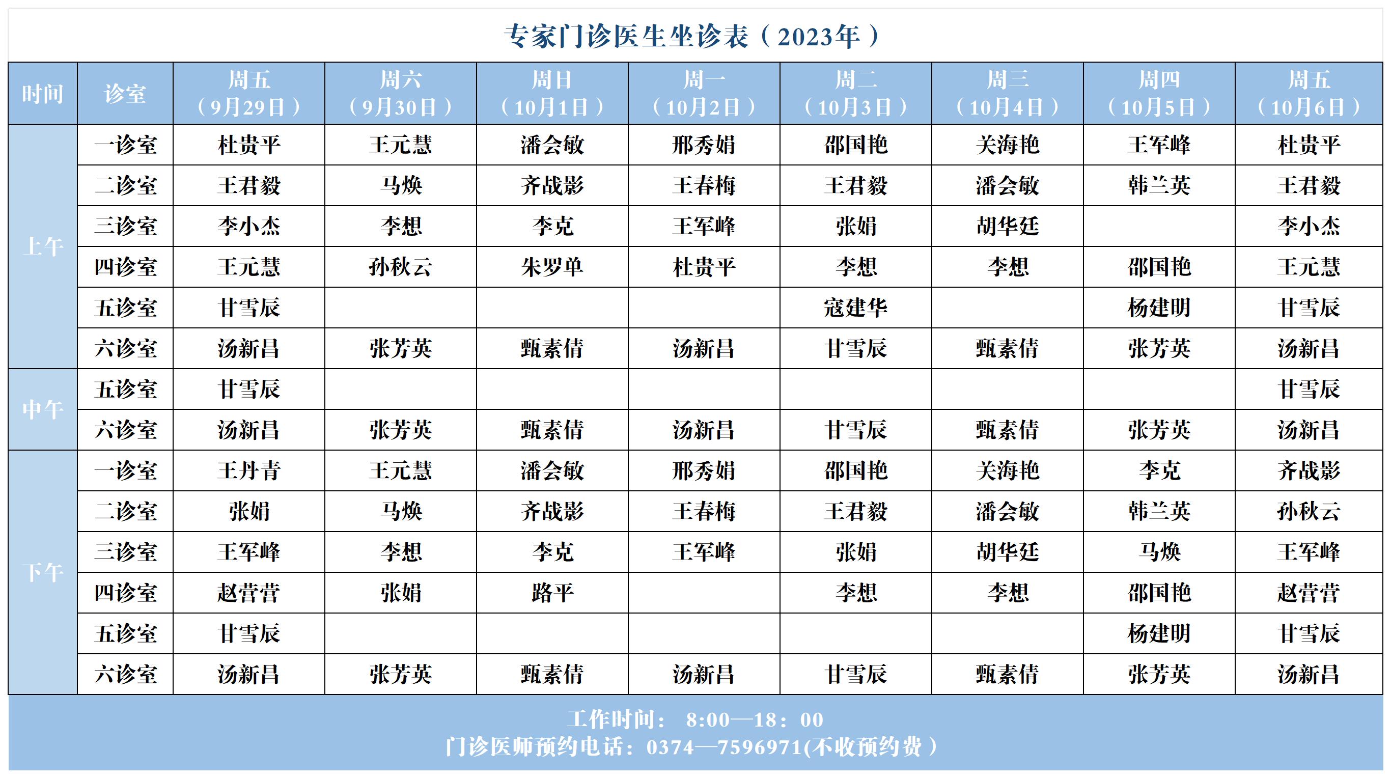 【坐诊信息】许昌市建安医院中秋节、国庆节假期期间门诊坐诊表(2023年9月29日-2023年10月6日)