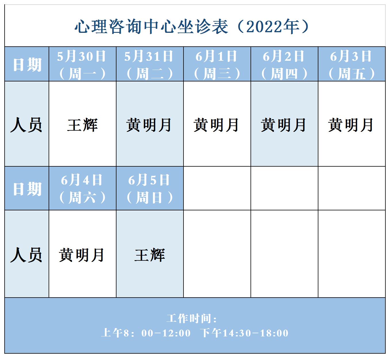 【坐诊信息】许昌市建安医院心理咨询中心坐诊表(2022年5月30日-6月5日)