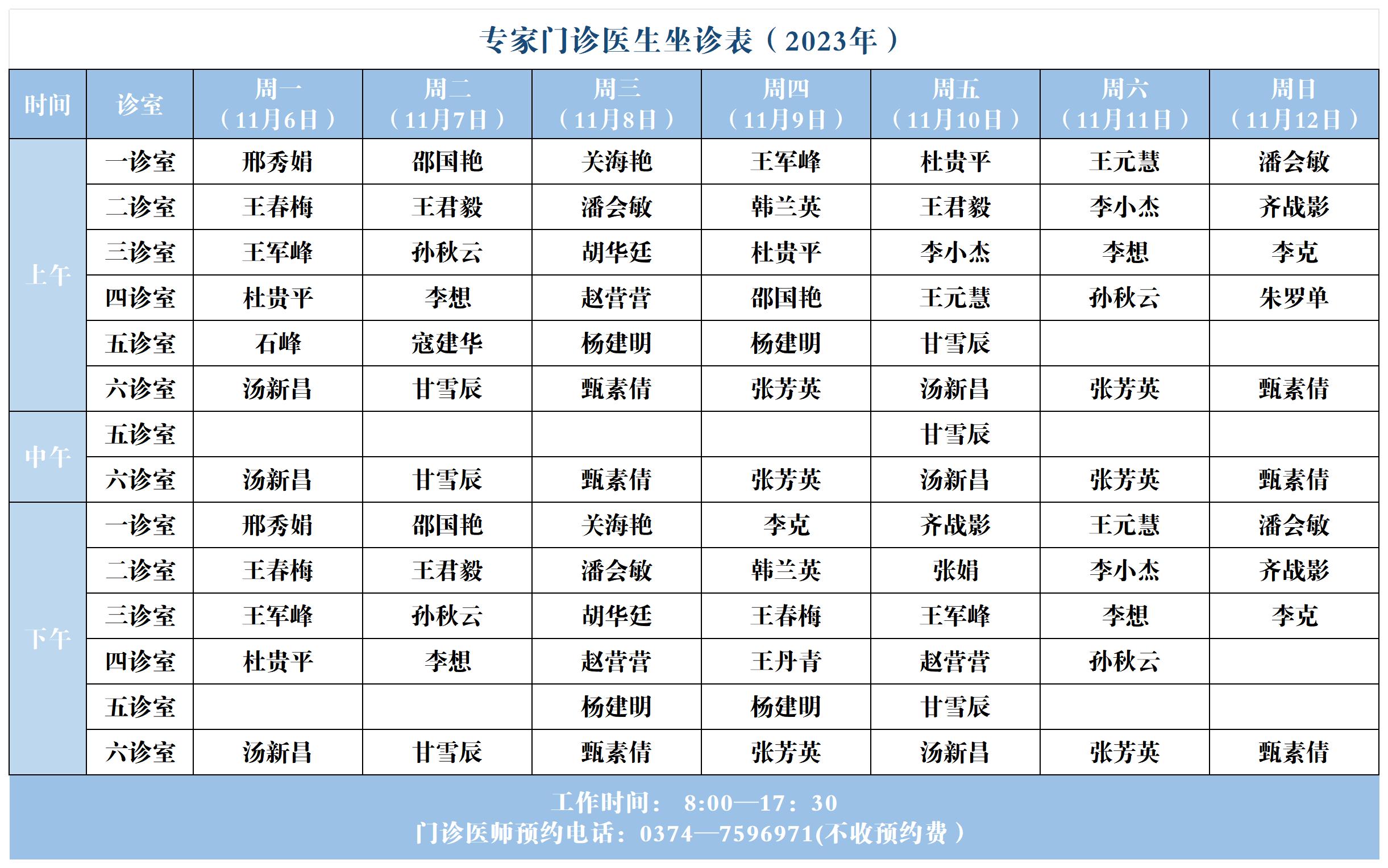 【坐诊信息】许昌市建安医院门诊坐诊表(2023年11月6日-11月12日)