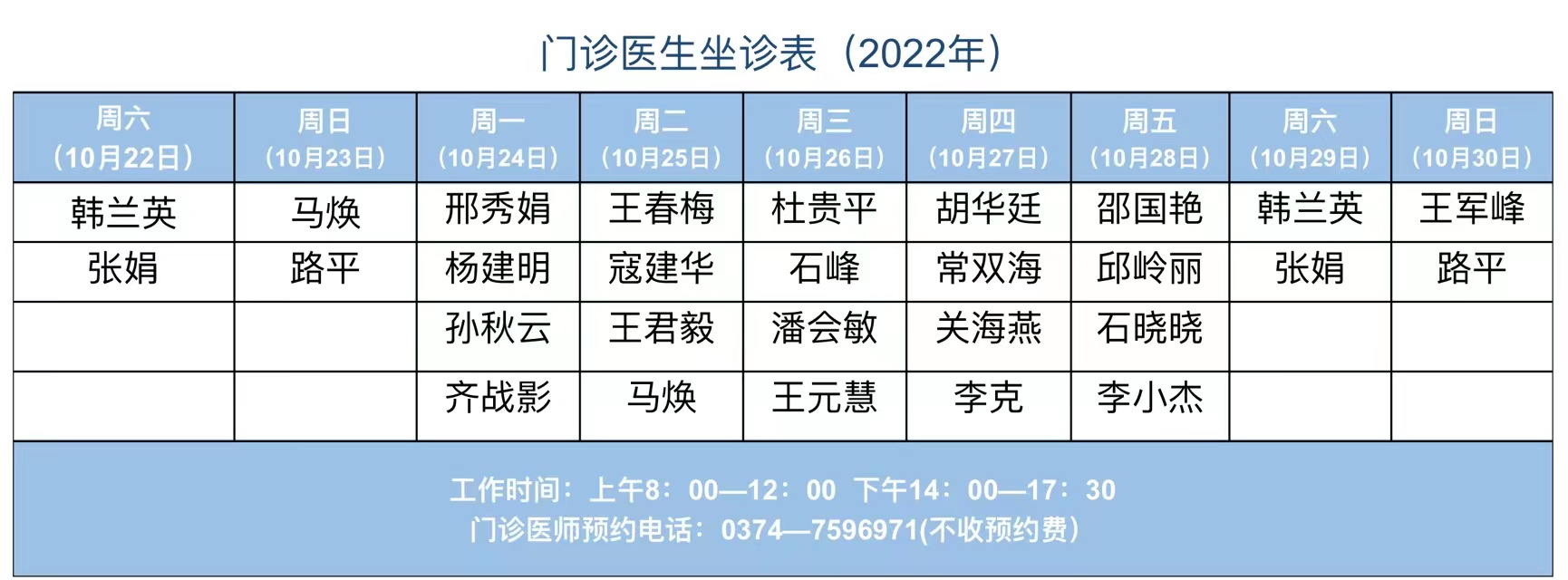 根据目前疫情防控形势,我院门诊医生坐诊时间临时调整,来院就诊人员可提前拨打0374-7596971进行咨询和预约,谢谢!