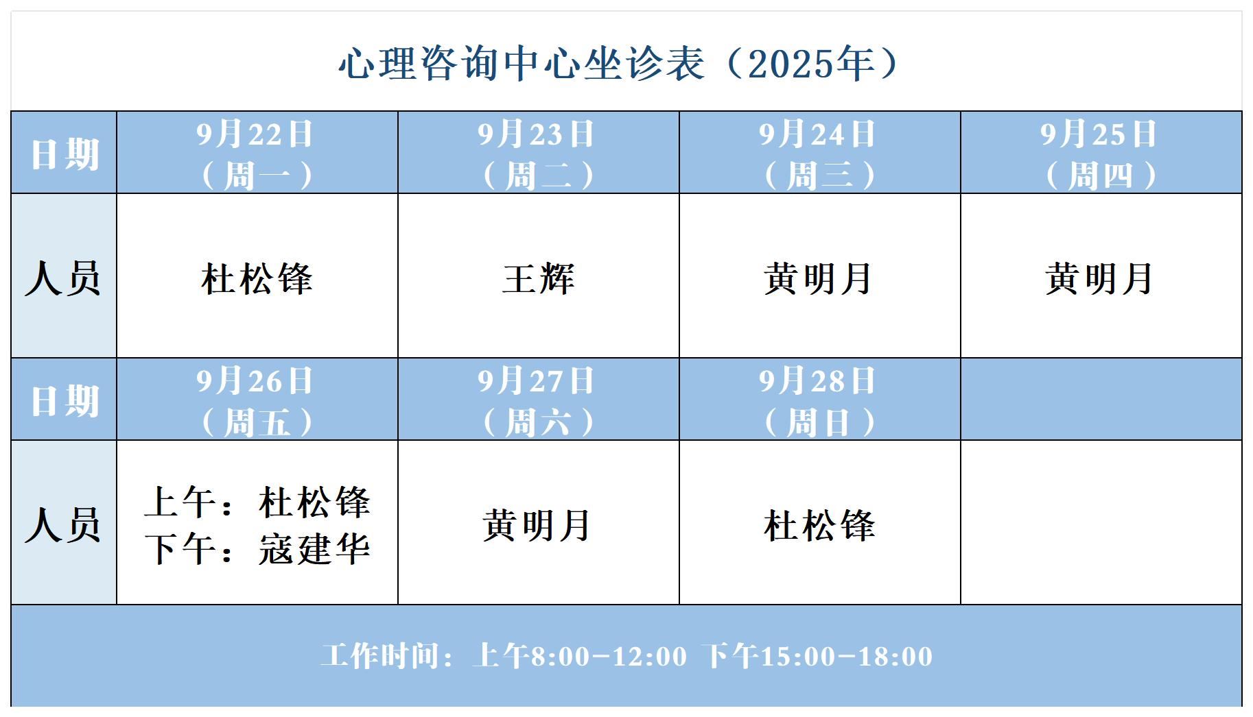 【坐诊信息】许昌市建安医院心理咨询中心坐诊表(2025年9月22日-9月28日)