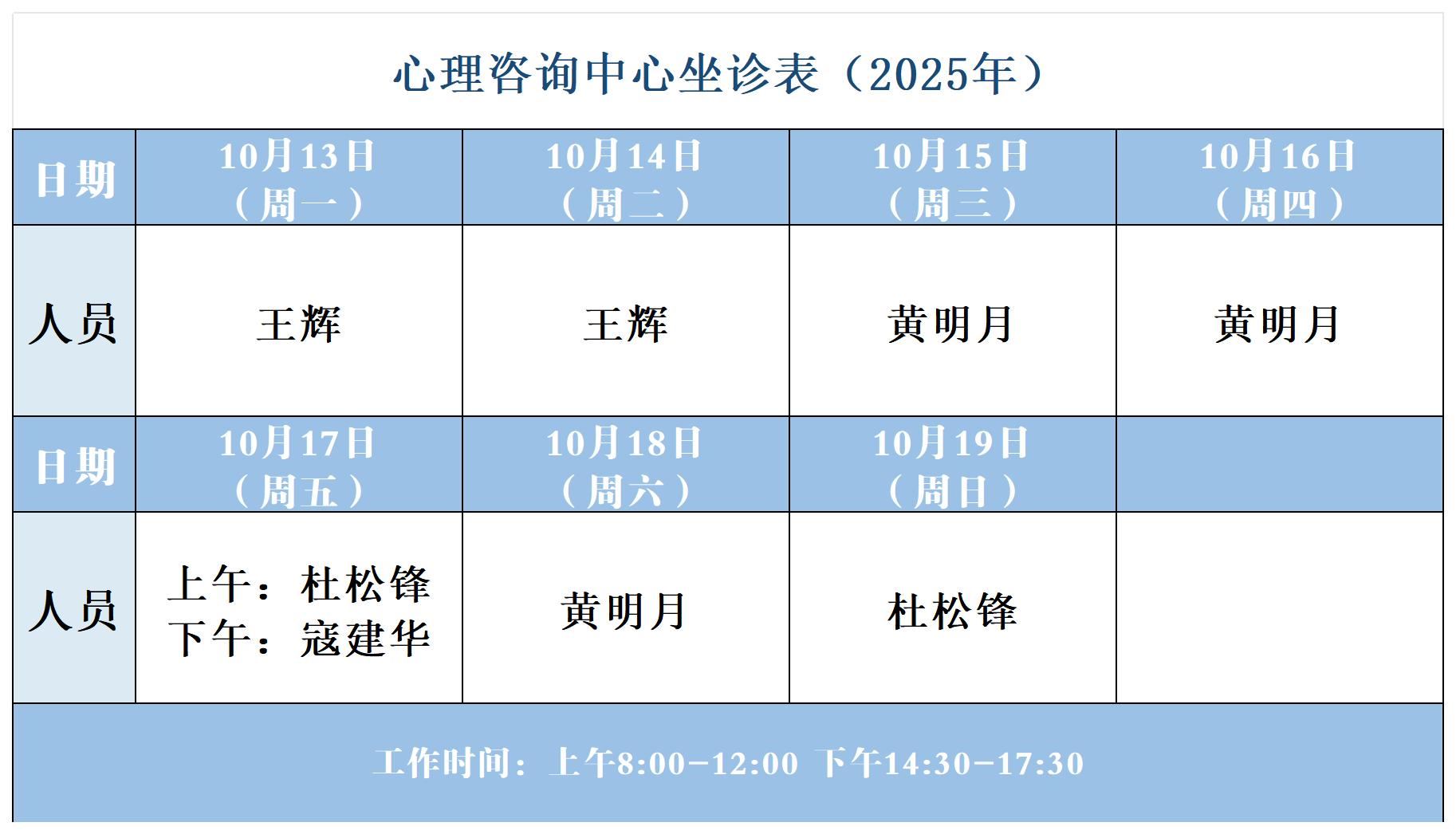 【坐诊信息】许昌市建安医院心理咨询中心坐诊表(2025年10月13日-10月19日)