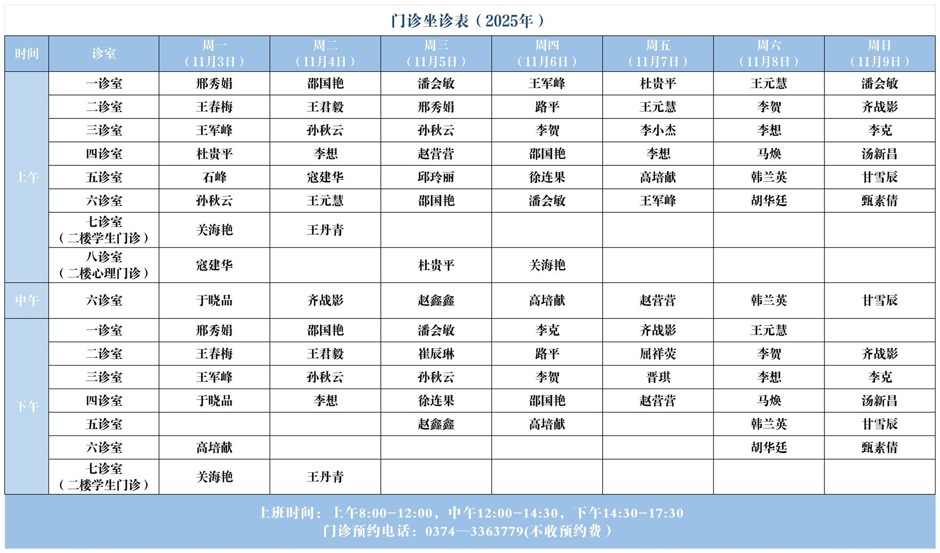 【坐诊信息】许昌市心理健康服务中心(东区门诊)坐诊表(2025年11月3日-11月9日)