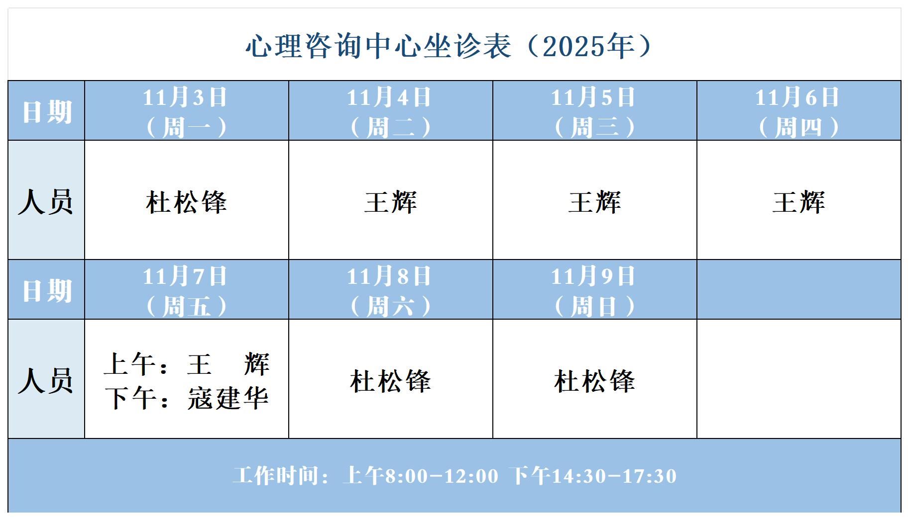 【坐诊信息】许昌市建安医院心理咨询中心坐诊表(2025年11月3日-11月9日)