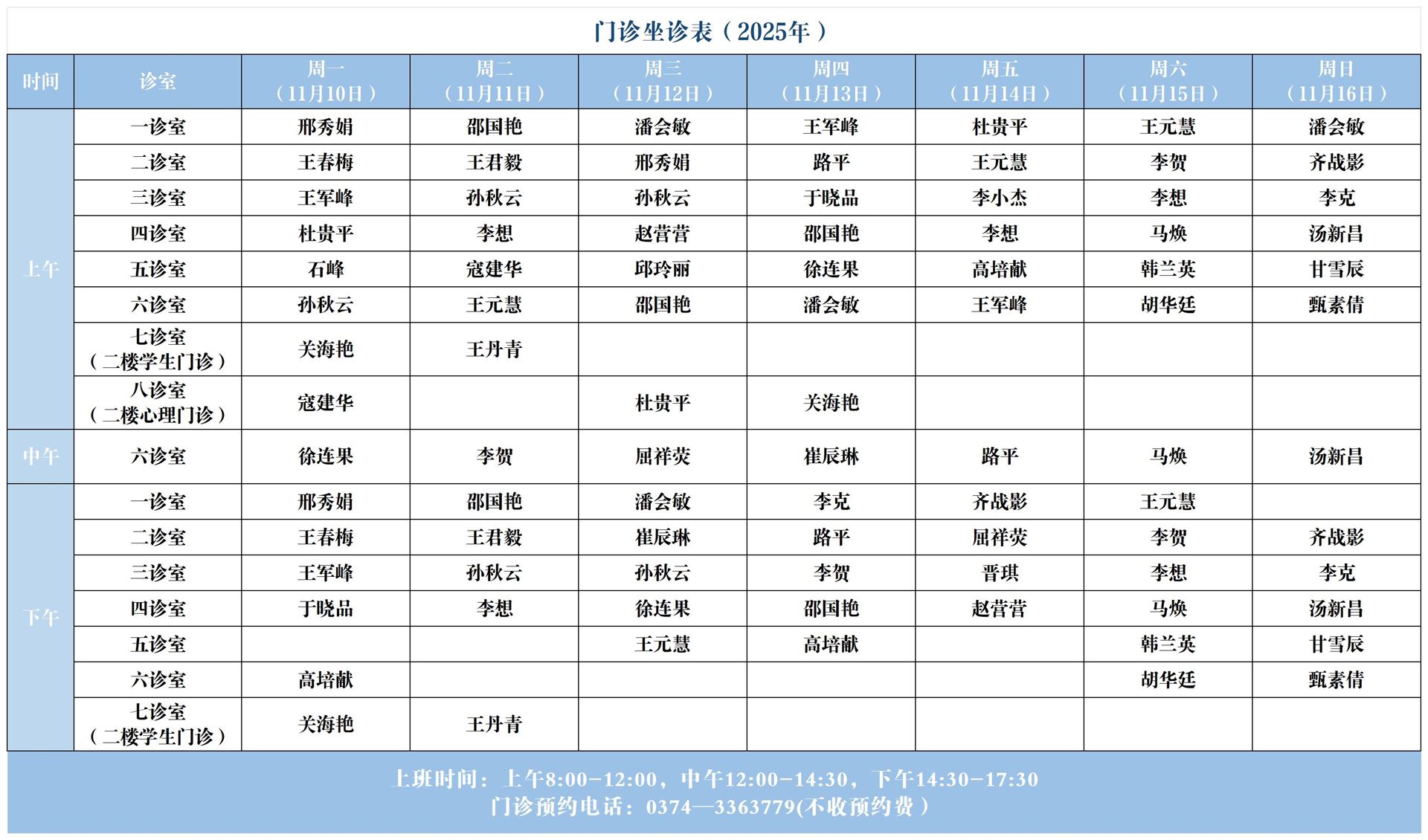 【坐诊信息】许昌市心理健康服务中心(东区门诊)坐诊表(2025年11月10日-11月16日)