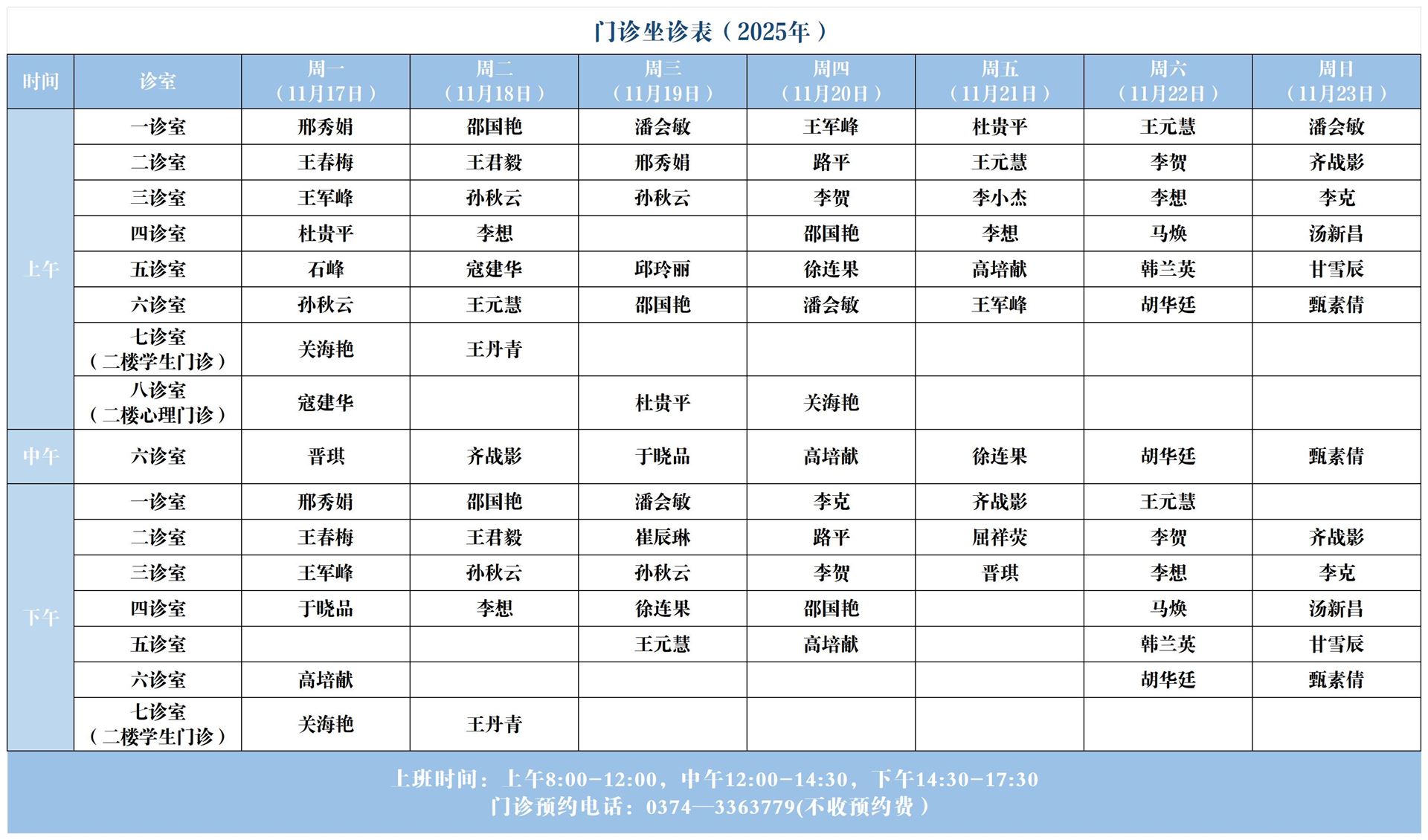 【坐诊信息】许昌市建安医院心理咨询中心坐诊表(2025年11月17日-11月23日)