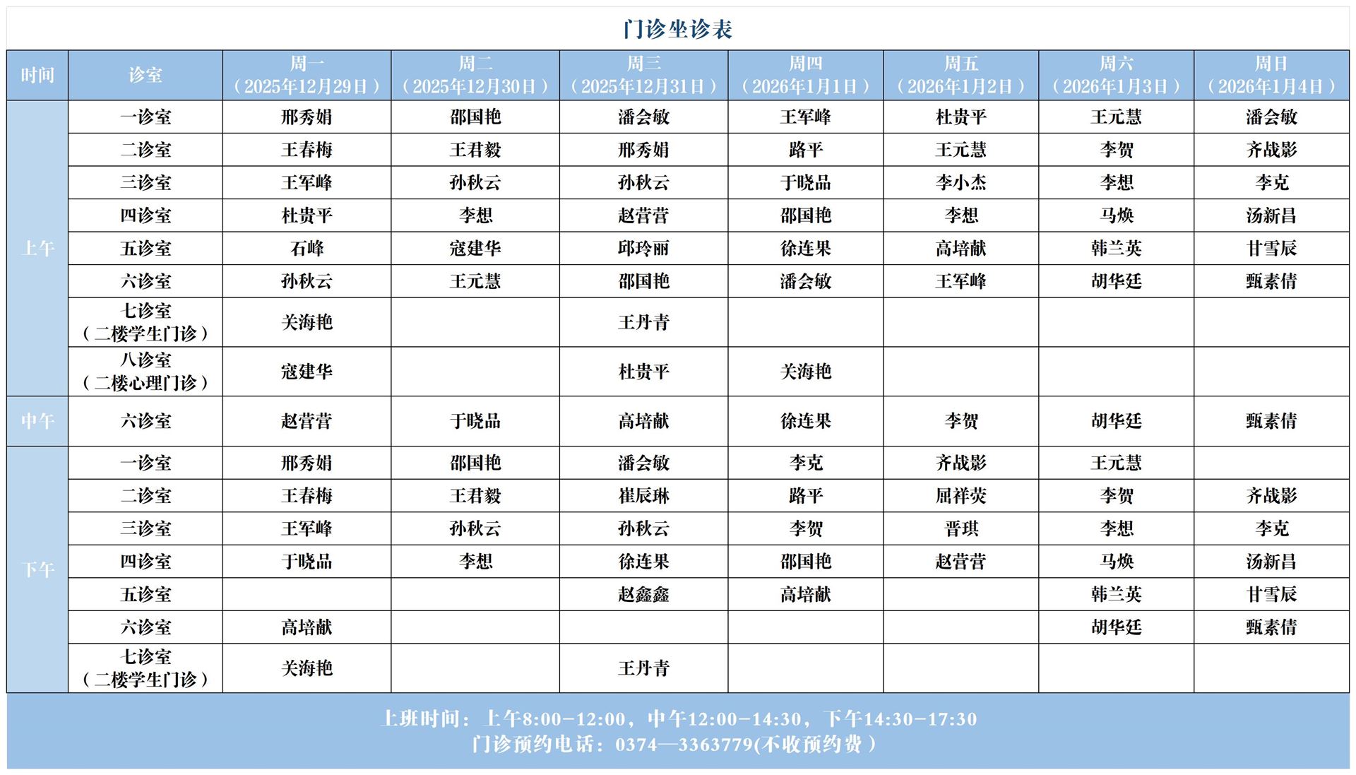 【坐诊信息】许昌市心理健康服务中心(东区门诊)坐诊表(2025年12月29日-2026年1月4日)