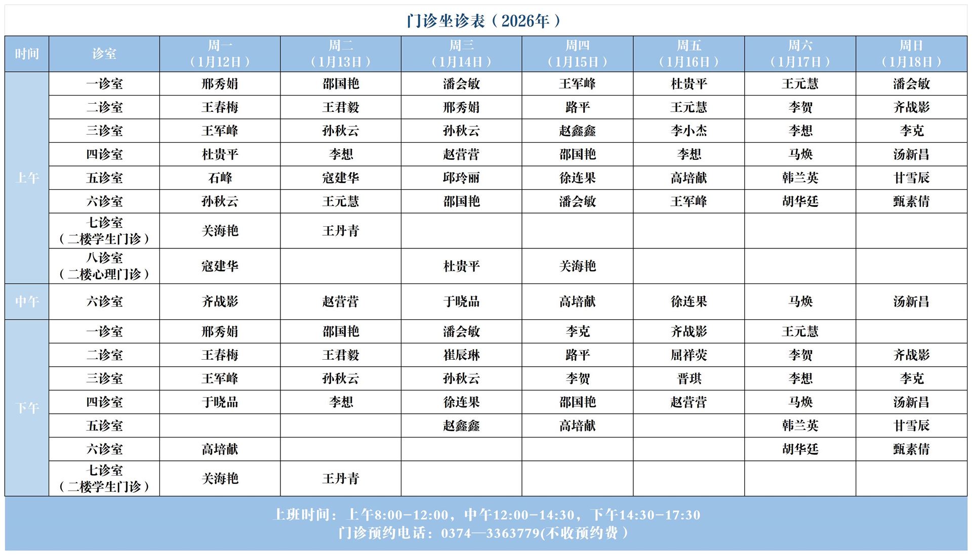 【坐诊信息】许昌市心理健康服务中心(东区门诊)坐诊表(2026年1月12日-2026年1月18日)