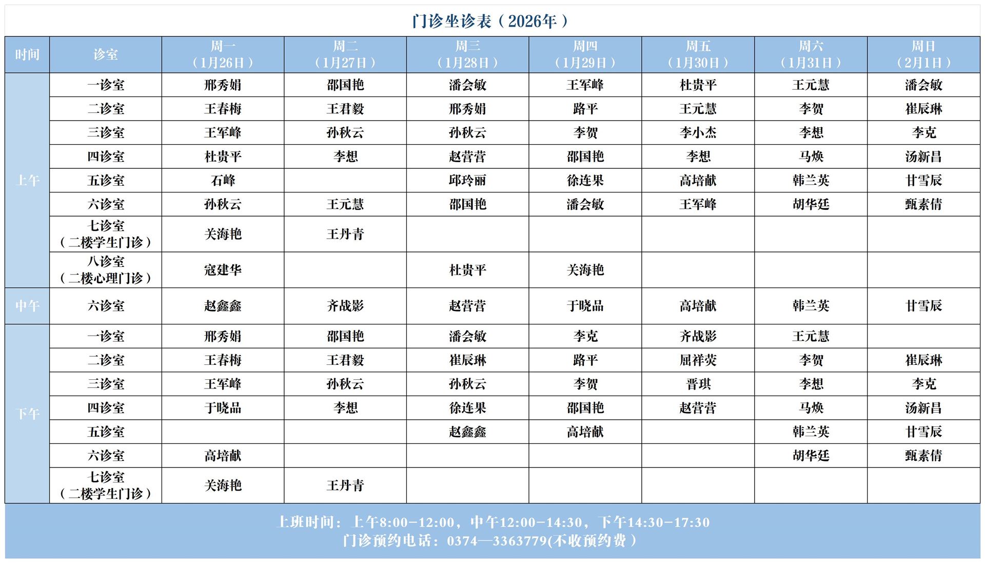 【坐诊信息】许昌市心理健康服务中心(东区门诊)坐诊表(2026年1月26日-2026年2月1日)
