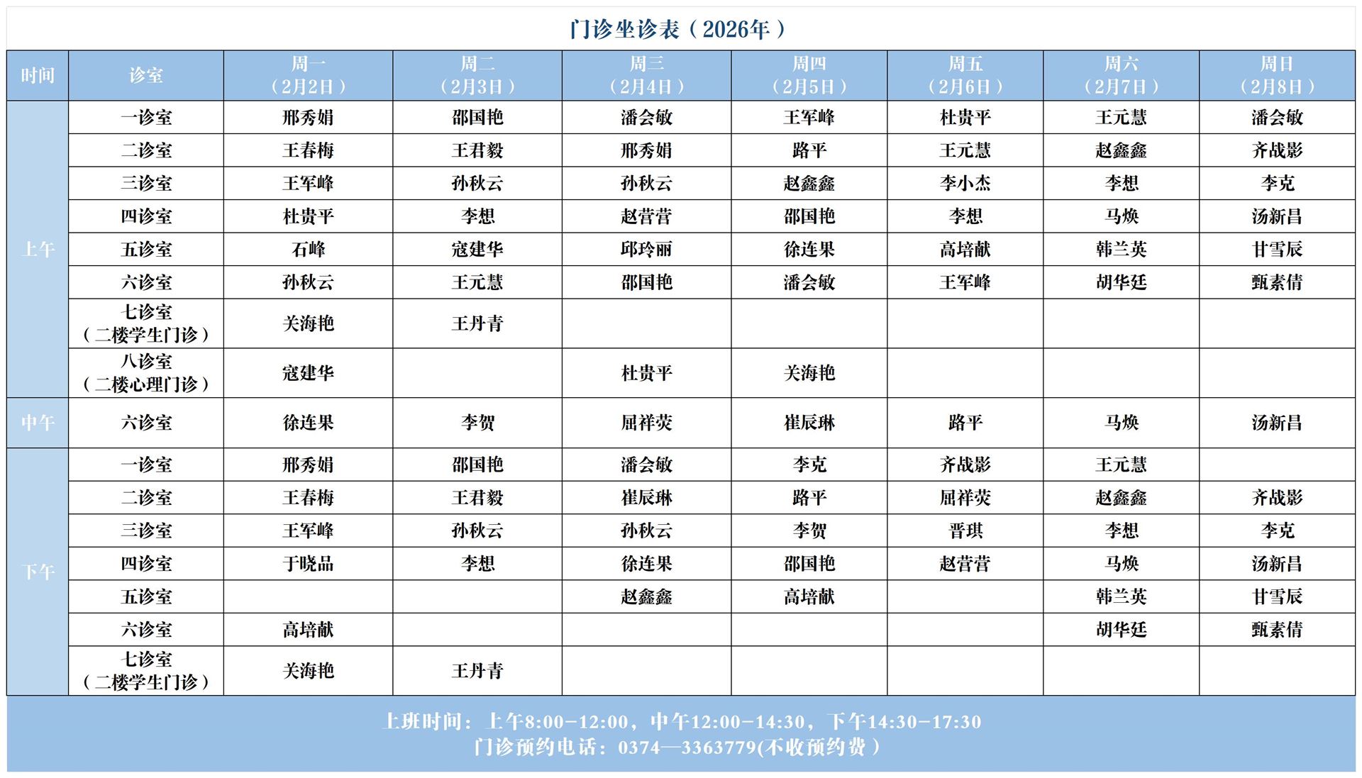 【坐诊信息】许昌市心理健康服务中心(东区门诊)坐诊表(2026年2月2日-2026年2月8日)
