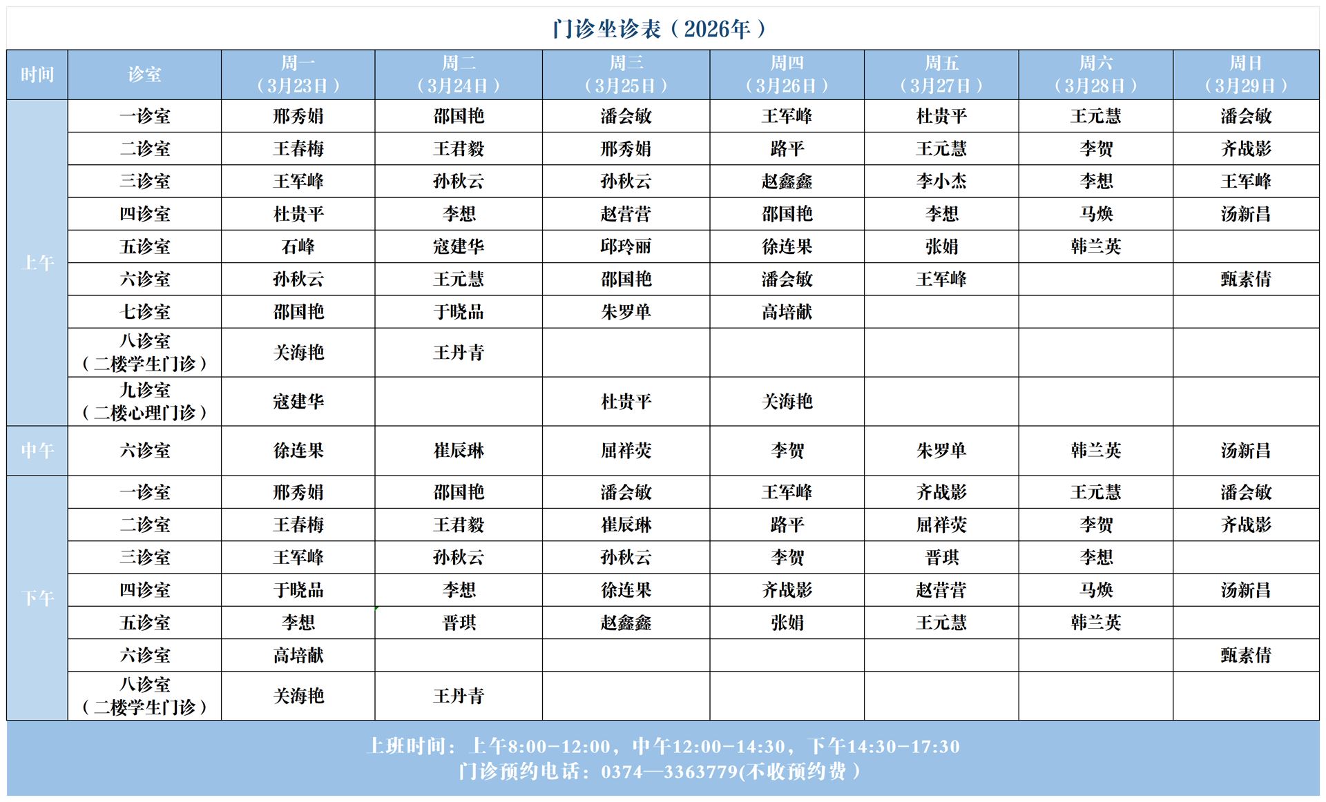 【坐诊信息】许昌市心理健康服务中心(东区门诊)坐诊表(2026年3月23日-2026年3月29日)