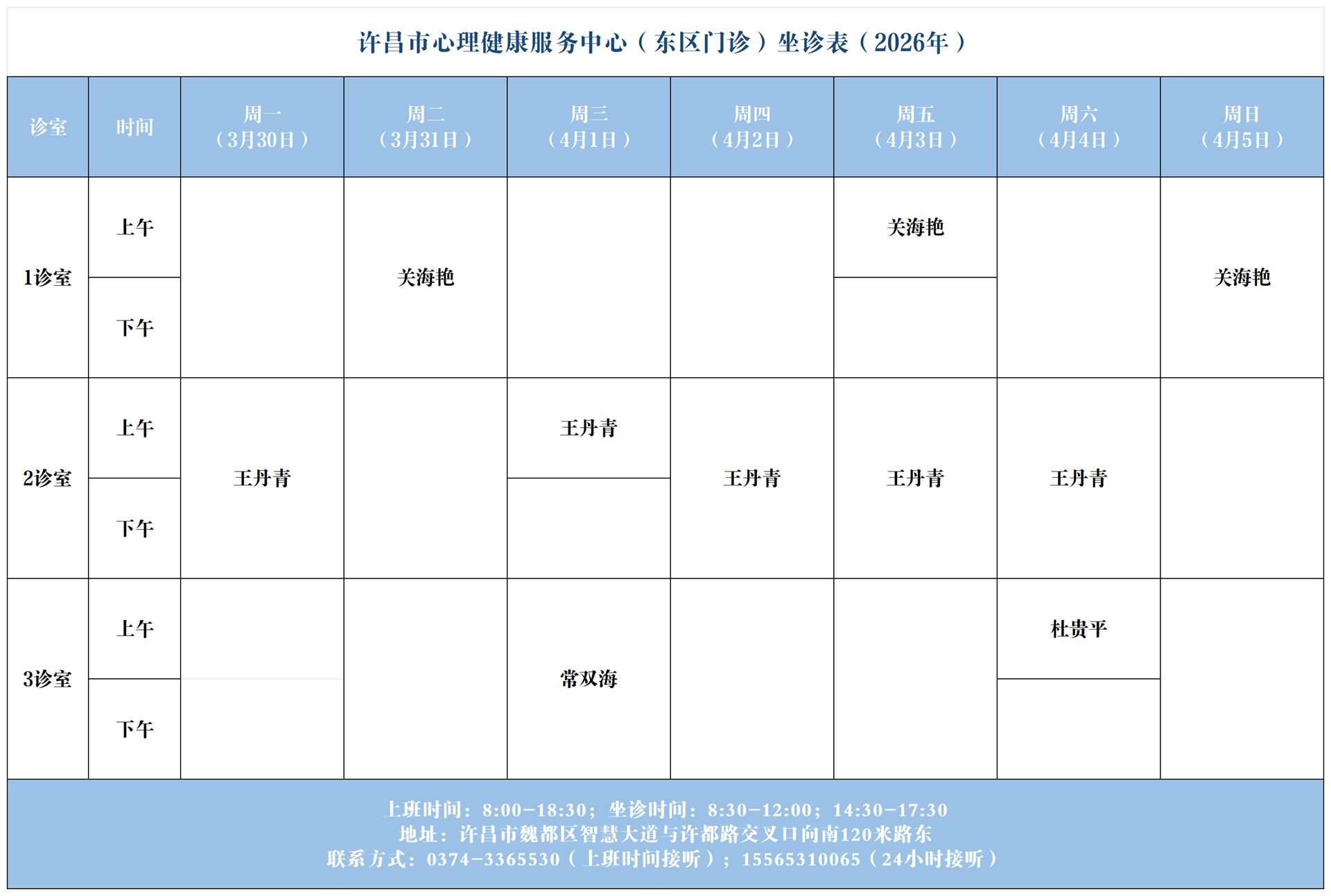 【坐诊信息】许昌市心理健康服务中心(东区门诊)坐诊表(2026年3月30日-2026年4月5日)