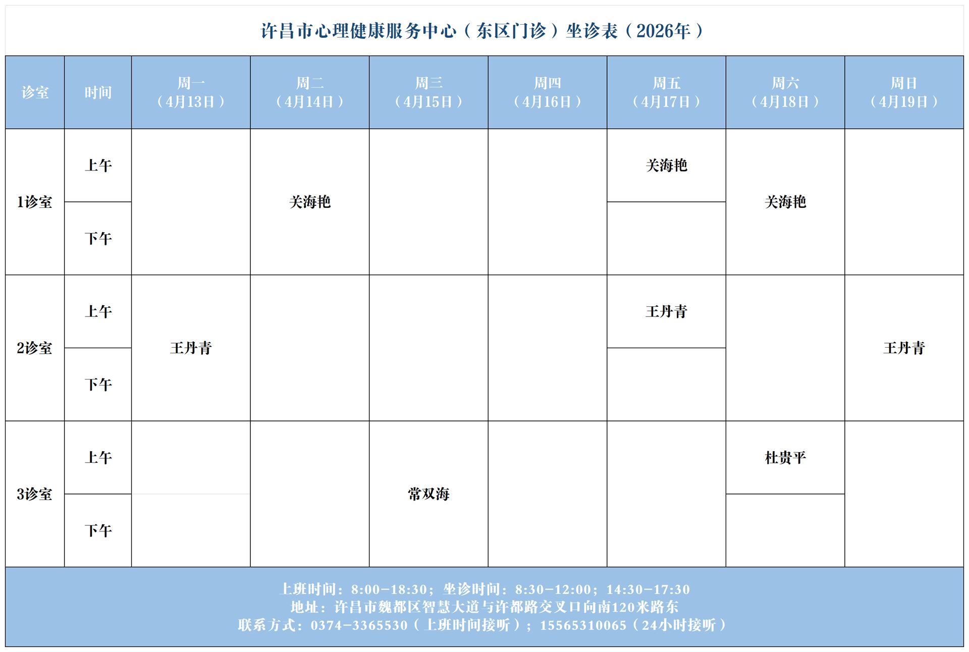 【坐诊信息】许昌市心理健康服务中心(东区门诊)坐诊表(2026年4月13日-2026年4月19日)