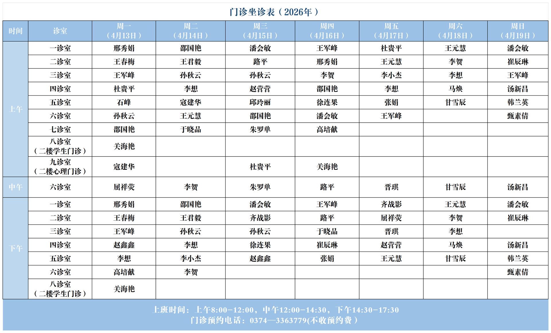 【坐诊信息】许昌市心理健康服务中心(东区门诊)坐诊表(2026年4月13日-2026年4月19日)