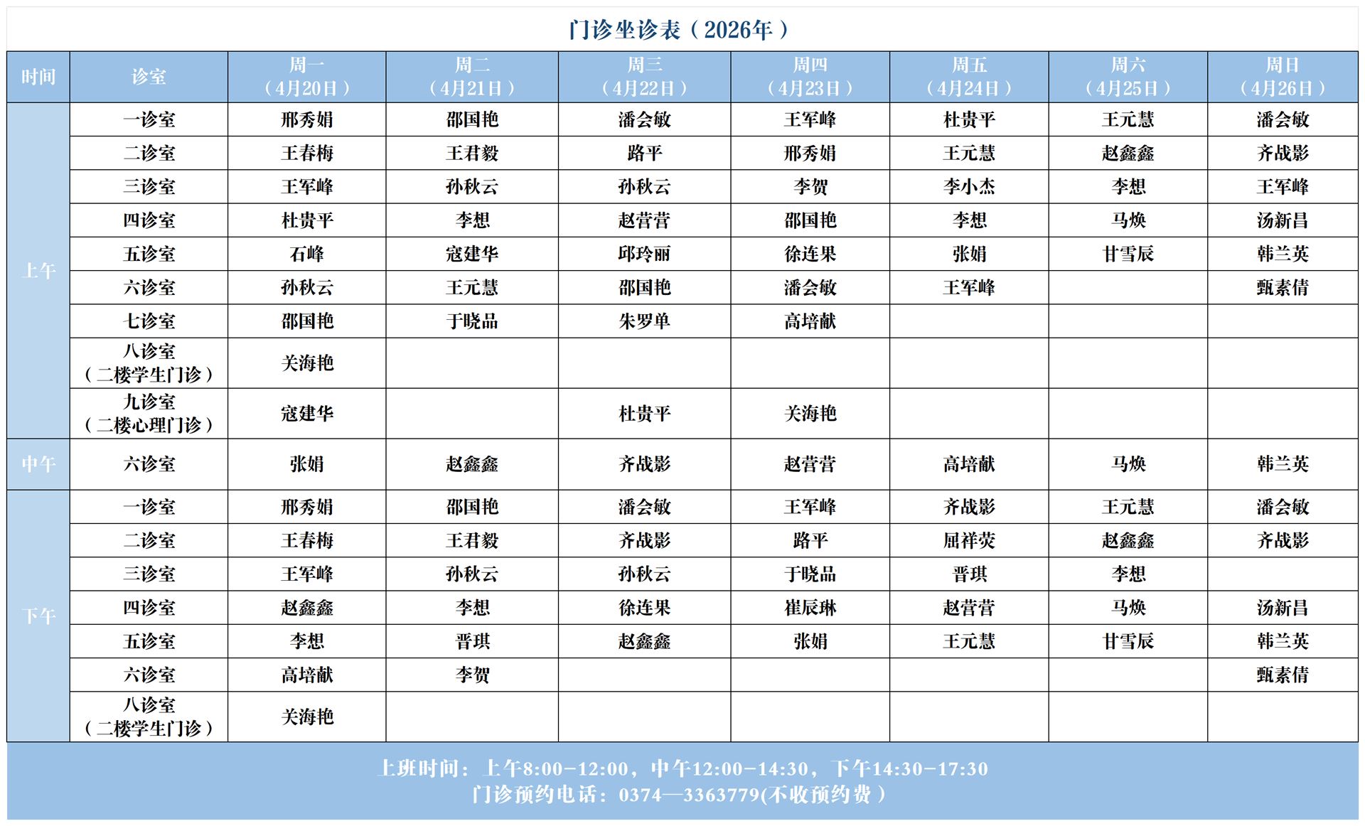 【坐诊信息】许昌市心理健康服务中心(东区门诊)坐诊表(2026年4月20日-2026年4月26日)