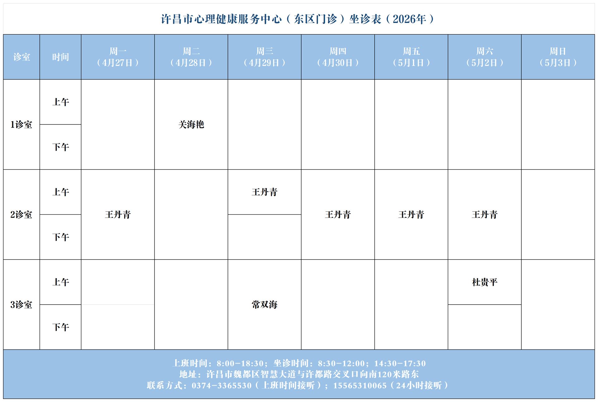 【坐诊信息】许昌市心理健康服务中心(东区门诊)坐诊表(2026年4月27日-2026年5月3日)