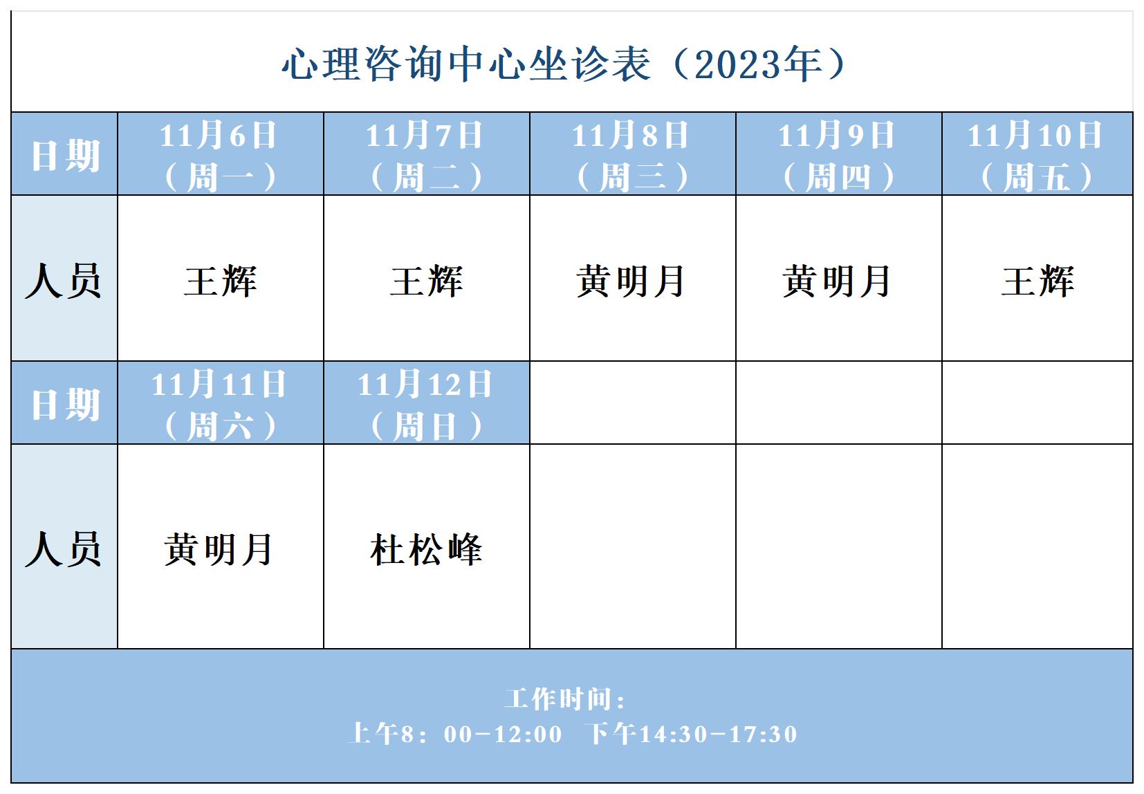 【坐诊信息】许昌市建安医院心理咨询中心坐诊表(2023年11月6日-2023年11月12日)