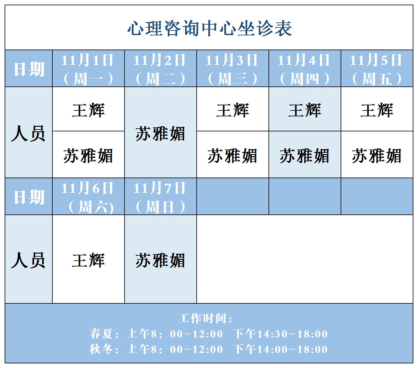 许昌市建安医院心理咨询中心坐诊表(11月1日-7日)