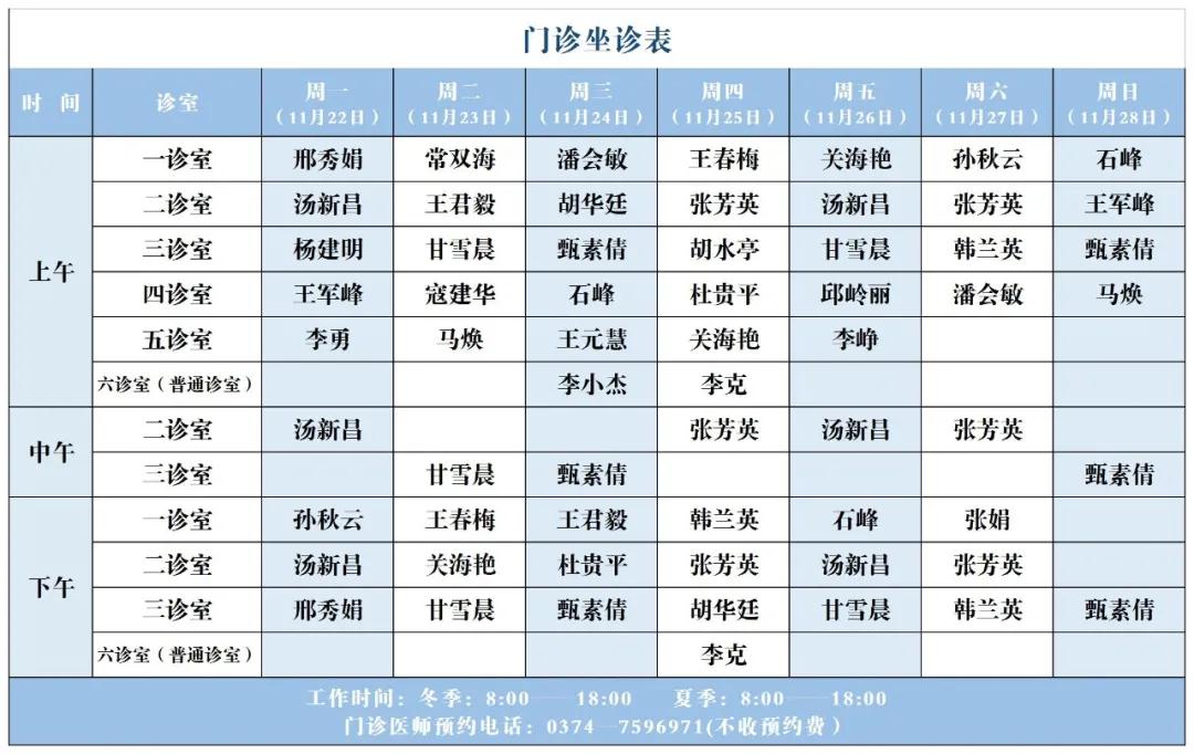 【坐诊信息】许昌市建安医院门诊坐诊表(11月22日-28日)