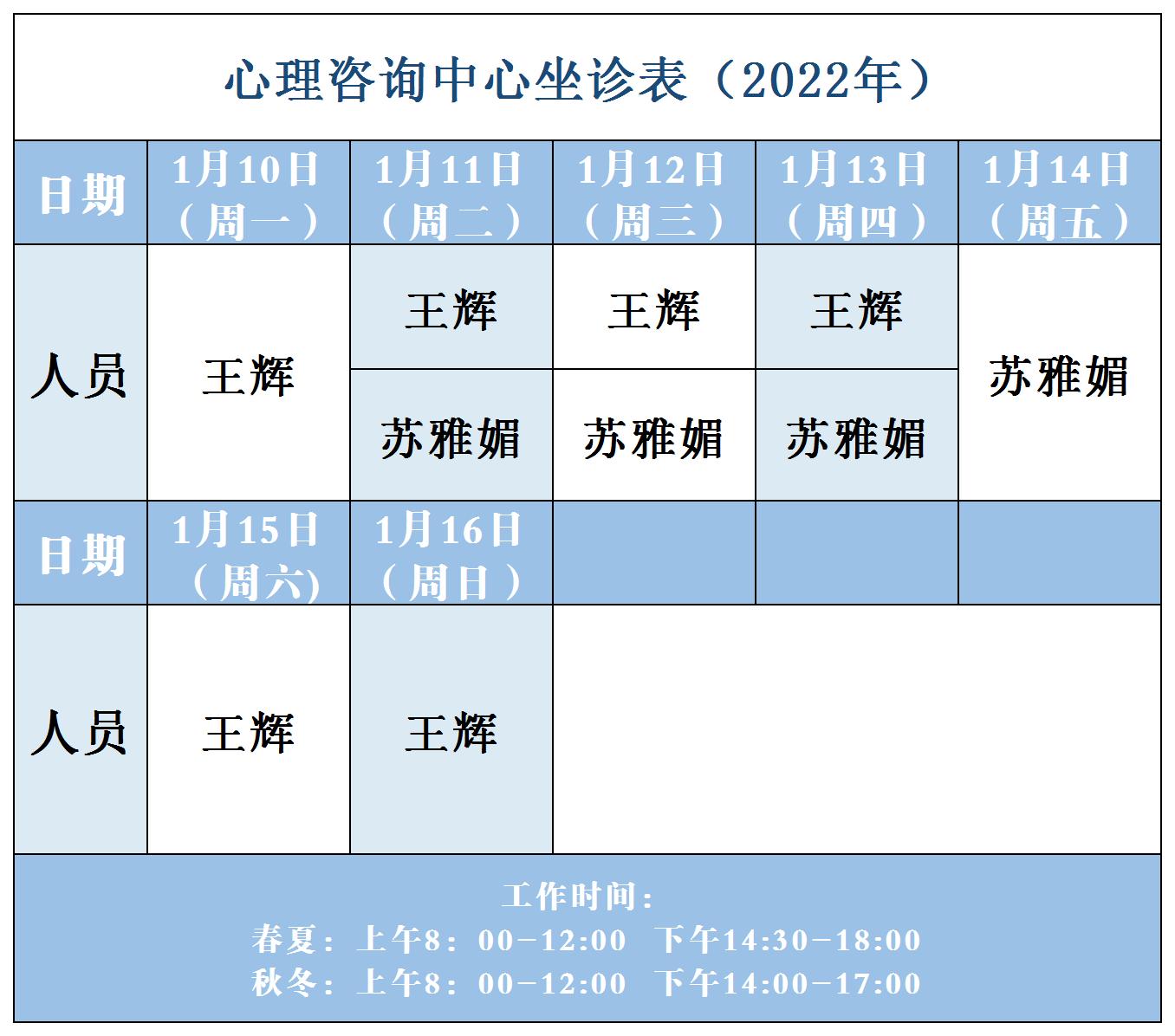 【坐诊信息】许昌市建安医院心理咨询中心坐诊表(2022年1月10日-1月16日)